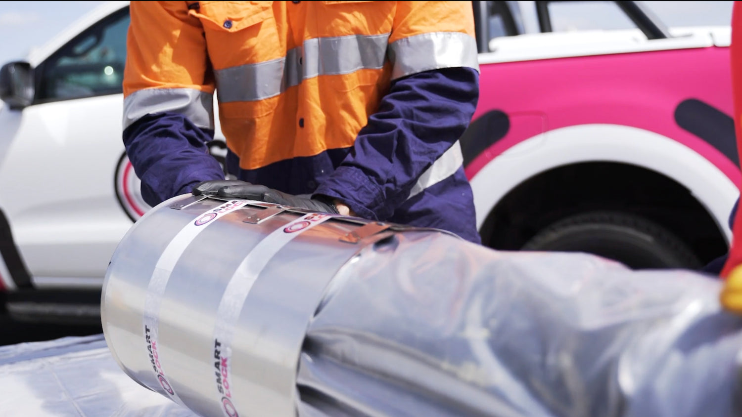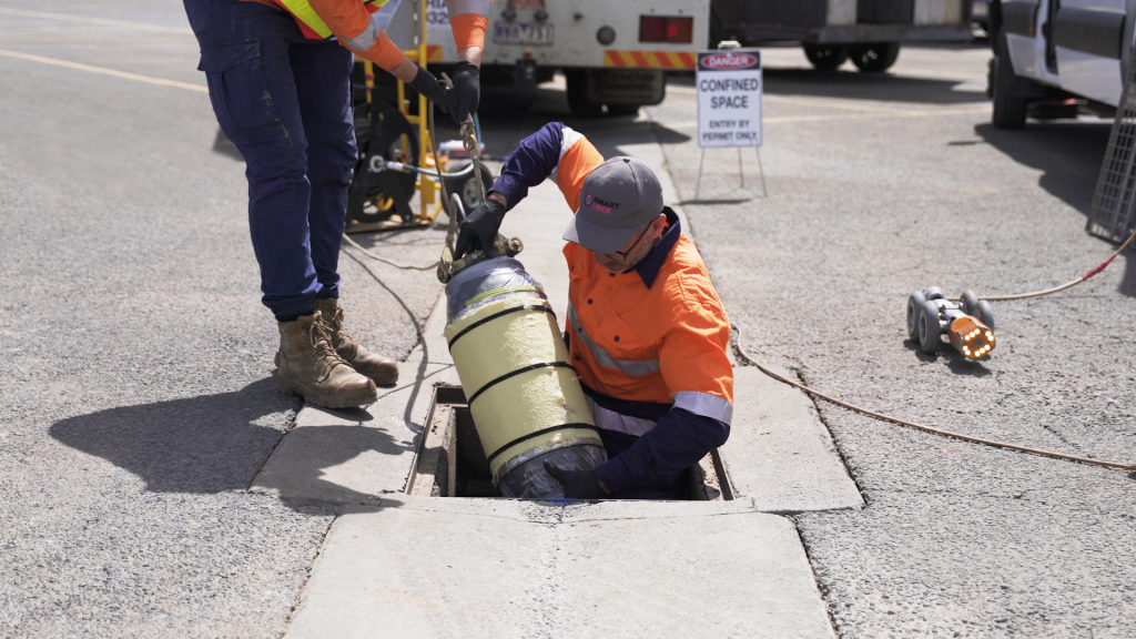 Smart Lock sleeves are installed with a nematic wheeled air packer. The installation is performed and monitored with specialised gauges and valves. The packer and sleeve is positioned with the aid of 2 x non stretch ropes, referencing a predetermined length transferred from a pre CCTV inspection.